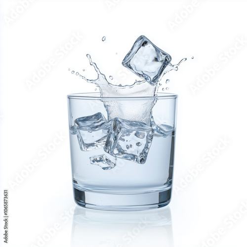 Refreshing splash as ice cubes dive into a glass of clear, cool water