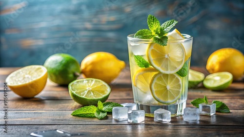 Refreshing summer drink, glass with fresh lemon and lime ice cubes floating in water , summer, feeling, fresh, lemon, lime, ice cubes