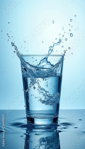 Refreshing water splash in glass against soft blue background. Hydration essence, pure liquid motion. Cool beverage, healthy thirst quencher. Promotes wellness and vitality with crisp, clean design.