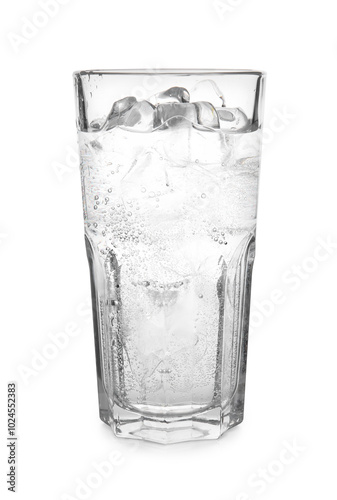 Refreshing water with ice in glass isolated on white