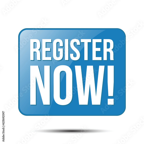 Register Now Button, Register Here, Badge, Emblem, Seal, Push Button, Realistic 3D Shiny And Glossy Registration Button Reflection, Design Element Isolated On White Background