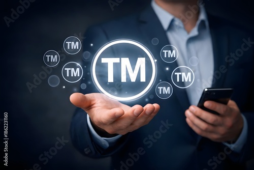 Registration or registration for trademark concept, copyright protection. Businessman holding register trademark logo on virtual screen.