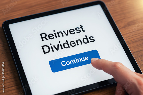 Reinvest dividends concept shown on tablet screen with finger pressing continue button