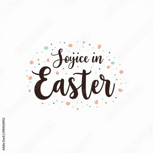 Rejoice in Easter calligraphy surrounded by pastel dots and Easter eggs, on a white background. Celebration and holiday theme