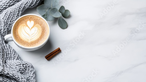 Relax with this serene flat lay showcasing a beautifully crafted coffee, accompanied by cinnamon sticks and eucalyptus leaves, all on a marble table