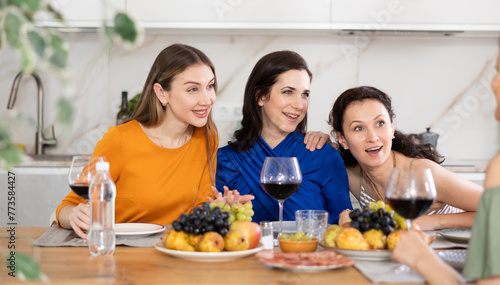 Relaxed adult female friends having fun at intimate house party, sharing stories and laughing gathered around table with wine and appetizers in cozy kitchen