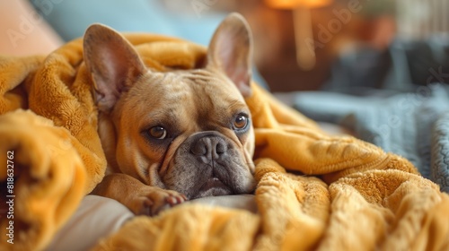 Relaxed French Bulldog in Cozy Bathrobe Decorating Wall for Inviting Pet Party Celebration. Charming, Smiling Canine Portrait with Copyspace for Custom Text.