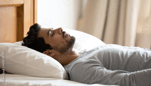 Relaxed man lying on bed enjoying peaceful afternoon nap in cozy bedroom with soft natural light and calm atmosphere