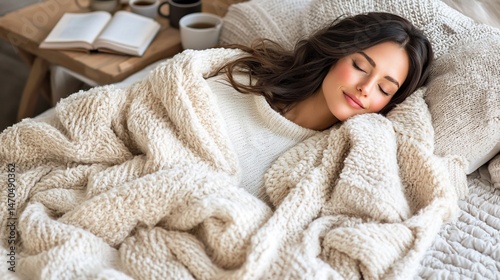 woman, sleep, bed, cosy, comfort, relax, warm, blanket, nap, rest, peaceful, sleepy, dream, cuddled, relaxation, calm, quiet, bedchamber, home, morning, afternoon, snooze, soft, gentle, feminine, pretty, beautiful, attractive, happy, content, well-being, healthy, stylish, lifestyle, comfortable, serene, dreamy, cover, knitted, beige, light, texture, fluffy, snug, warmth