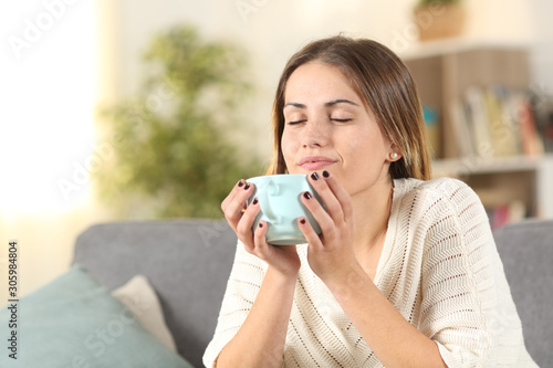 hot drink, woman, drink, drinking, smell, smelling, relax, home, mind, meditating, happy, peace, tea, people, smiling, hand, cup, person, girl, couch, breath, breathing, mug, apartment, pensive, breakfast, health, house, holding, morning, lady, sofa, closed, eye, lifestyle, young, tenant, stress, relief, dream, well-being, well, being, wellness, favor, favor, cafes, caffeine, time