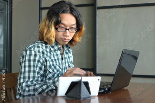 Relaxed young Asian hipster man working against laptop and tablet in his office.