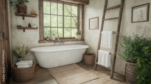 Relaxing bathroom retreat with vintage charm cozy natural decor serene greenery inviting atmosphere aesthetic interior design