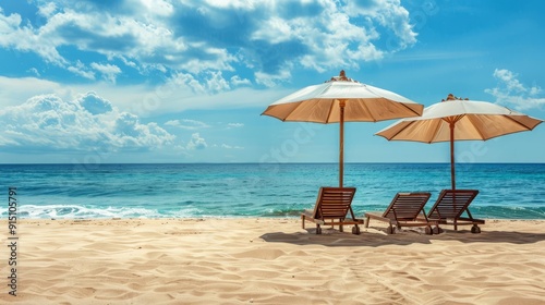 beach, ocean, sea, sand, sky, cloud, sun, chair, lounger, umbrella, vacation, tropical, paradise, summer, holiday, travel, relaxation, calmness, blue, white, gold, water, horizon, idylli, peaceful, beautiful, sunshine, coastal, shoreline, beachfront, landscape, nature, scenery, outdoors, bright, happy, get-away, beach resort