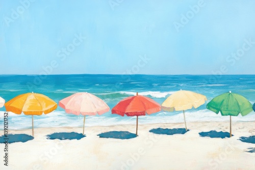 Relaxing day at a colorful beach under bright sunshine with vibrant umbrellas scattered along the shore