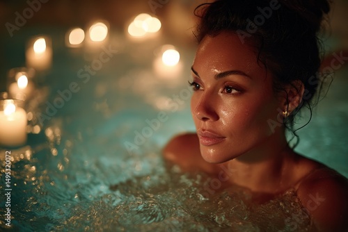 Relaxing evening in a candlelit hot tub with a woman enjoying tranquility and warmth