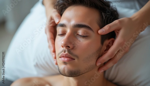 spa treatment, skincare, male model, relaxation, wellness, beauty, closeup, hand, healer, massage therapist, man, young men, face, skin, grooming, pampering, serenity, calm, peaceful