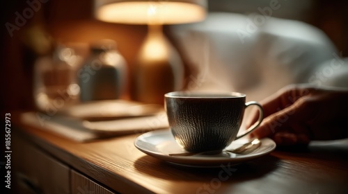 hot drink, morning, wooden, nightstand, bedside, lamp, cosy, pillow, relaxation, warm, drink, kitchen, home, comfort, atmosphere, tableware, porcelain, cup, detail, space, lighting, still, life, calmness, warmth, beverage, daily, routine, decor, interior, design, quiet, moment, preparation, lifestyle, hot, soothing, rest, environment, sleep, relax, peace, simplicity, minimalism, evening, refreshment, aesthetic, saucer, zone