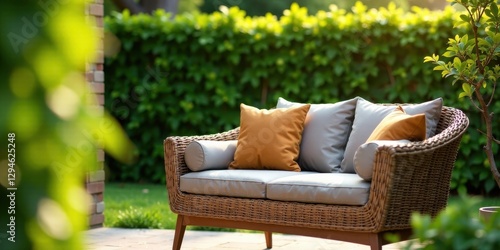 Relaxing Patio Wicker Loveseat with Soft Cushions in a Lush Garden Setting
