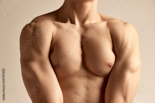 Relief body shape. Cropped image of strong, relief, muscular male breast and hands over grey studio background. Masculinity. Concept of men's health and beauty, body and skin care, fitness. Body art