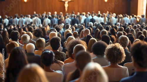 Religious people in a Christian church worshipping God Jesus Christ Group of believers praying for salvation Cross crucifixion Heaven hope Resurrection faith Forgiveness Holy Bible community Gospel