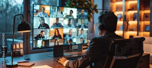 remote, team, leader, virtual, meeting, digital, collaboration, work, home, office, modern, professional, communication, screen, headset, telecommuting, business, management, computer, technology, conference, video, call, teamwork, workspace, lighting, interior, online, connection, decor, evening, sharpened, project, discussion, corporate, planning, organisation, productivity, efficiency, table, chair, design, plant
