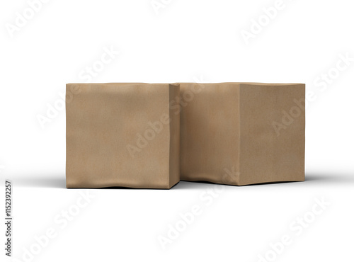 Rendered image of a small cubic cardboard box with dents on a transparent background