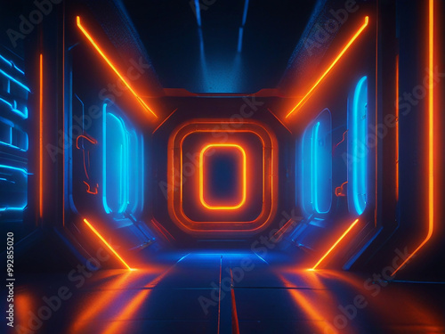 Rendering abstract futuristic background with glowing neon blue and orange lights
