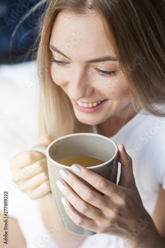 adult, alone, attractive, beautiful, beauty, bed, bedding, bedchamber, bedtime, body, calm, care, caucasian, charming, cheerful, closeup, hot drink, comfortable, cosy, cup, cute, dream, drink, face, female, girl, health, human, isolated, light, morning, nap, 1, only, person, relax, relaxation, relaxed, rest, serene, sleep, sleepy, smile, sunny, white, woman, woman, young, vertical