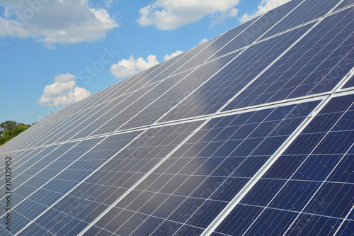 Renewable Energy Concept. Solar panel power plant with dust against blue sky and white clouds background