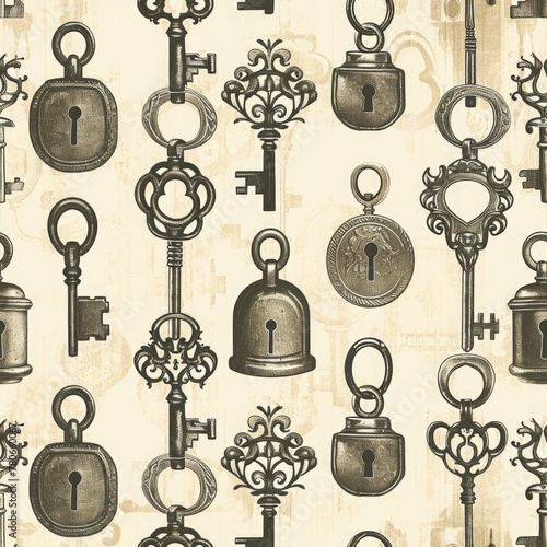 Repeating pattern of vintage keys and lock motifs in sepia tones. seamless
