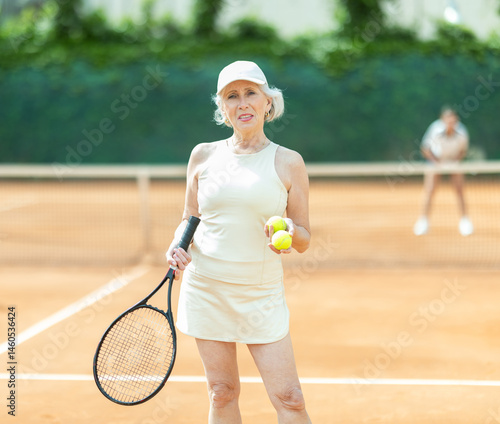 Representative shoot of member of European Championship tennis player sports club. Mature female team player pose on tennis court..