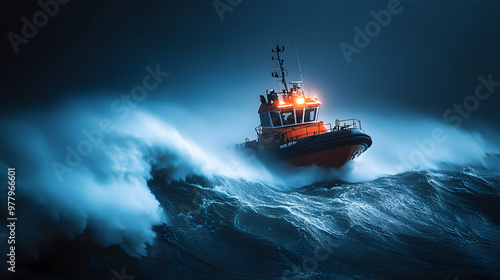 Rescue lifeboat in action during a stormy night with high waves and strong winds