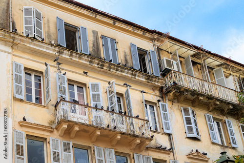 Residential building with overhead power lines and antennas in the old town of Corfu on the island of Corfu