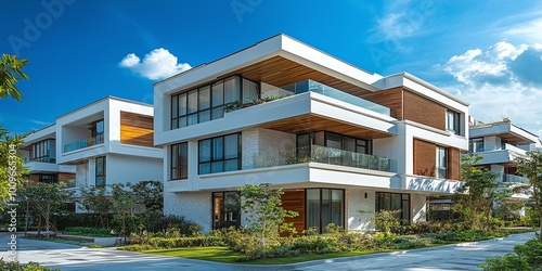 residential tower with a contemporary glass and stucco facade, featuring wooden accents and a sleek modern design, perfectly contrasting with the blue sky