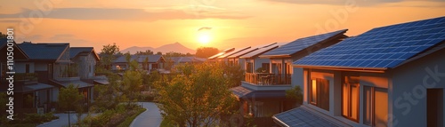 Residential urban neighborhood with solar panels on rooftops, glowing under the fading light of a beautiful sunset