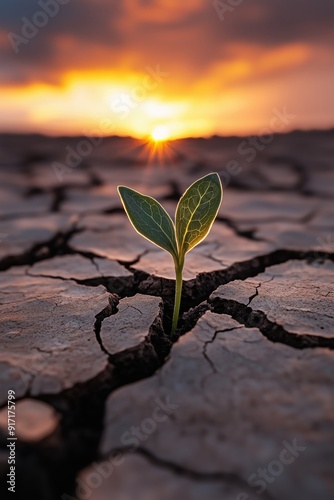 resilience, hope, renewal, environment, climate, change, drought, plant, green, growth, nature, survival, sunset, dirtied, cracked, dry, earth, symbol, strength, perseverance, life, new, beginning, landscape, contrast, harsh, condition, sunlight, agriculture, ecology, sustainability, future, recovery, inspiration, determination, natural, beauty, scene, dramatic, sky, horizon, evening, light, hopefulness, rebirth, endurance, challenge