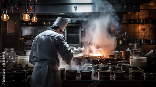 Restaurant Kitchen, Chef Wearing Hat and Cooking Food with Fire and Heat, Generative AI