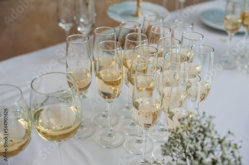 alcohol, beverage, champaign, food, furniture, glasses, meal, party, plate, eatery, snack, wedding, white wine, wine, wine glass