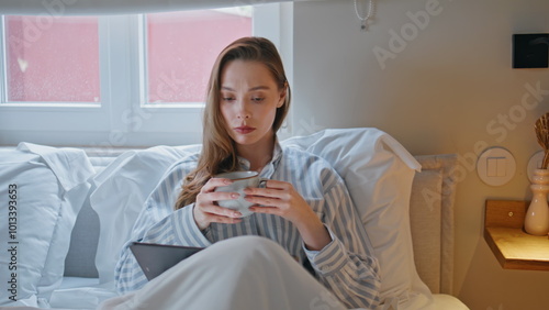 Resting lady holding cup coffee in cozy bedroom looking tablet screen closeup.