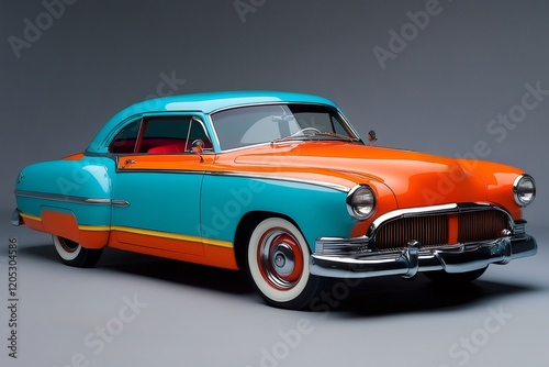 Restored two-tone classic car gleaming under studio lights