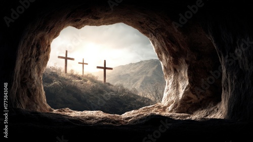 Resurrection Scene Featuring Three Crosses on a Hill Viewed from Inside a Dark Cave