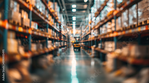 Retail warehouse full of shelves with goods in cartons, with pallets and forklifts. Logistics and transportation blurred background. Product distribution center