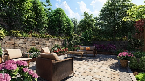 Retaining wall adds structure to a paver patio elegant layout cozy furnishings surrounded by greenery peaceful and chic