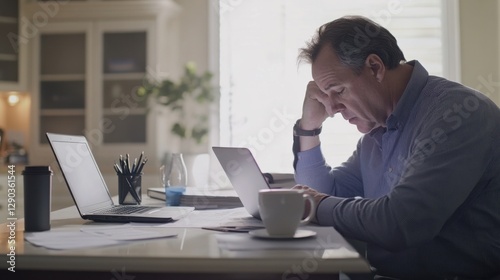 retirement, financial, stress, quiet, study, sharpened, worry, emotional, burden, planning, article, desk, laptop, hot drink, cup, paper, modern