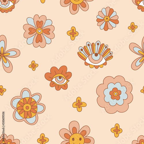 Retro 70s 60s Evil Eye Floral Hippie Summer Groovy Flower Power vector seamless pattern. Boho Flower child vibes background. Bohemian retro colours flora pink backdrop surface design.