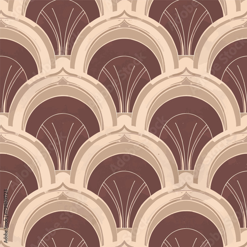Retro Boho Geometric Arch Seamless Pattern with Layered Maroon, Peach, and Charcoal Tones, Vintage Decorative 70s Style Vector Background for Wallpaper and Textile Design