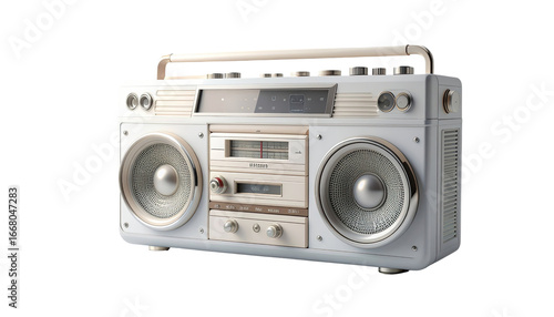 Retro boombox with vintage design and colorful speakers isolated on white background
