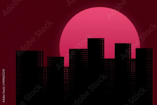 city landscape, silhouette, retro, sunset, futuristic, building, skyline, city, circle, magenta, abstract, urban, dark, design, graphic, architecture, night, vintage, background, style, scene, minimalist, landscape, red, modern, illustration, neon, atmosphere, geometric, dreamy, structure, template, metropolis, view, poster, wallpaper, horizon, pattern, decorative