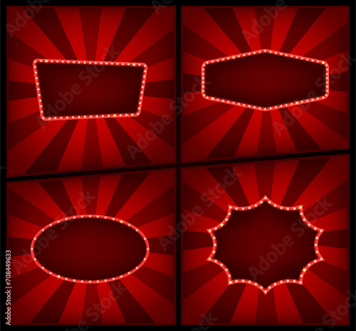 Retro lightboxes, cinema signs or billboard signage. Lightbulb isolated on transparent background for party poster. Promotion and sale billboard, cinema, bar show or restaurant. Vector illustration