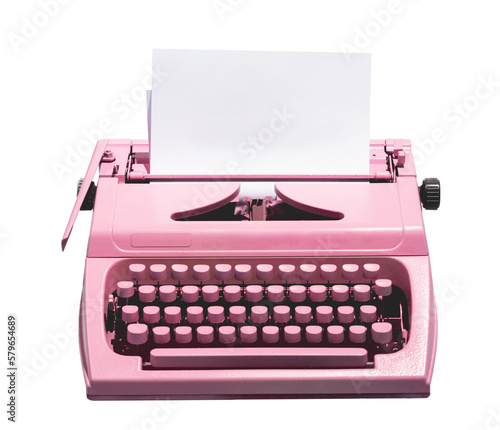 Retro pink typewriter with empty page. Isolated on transparent white